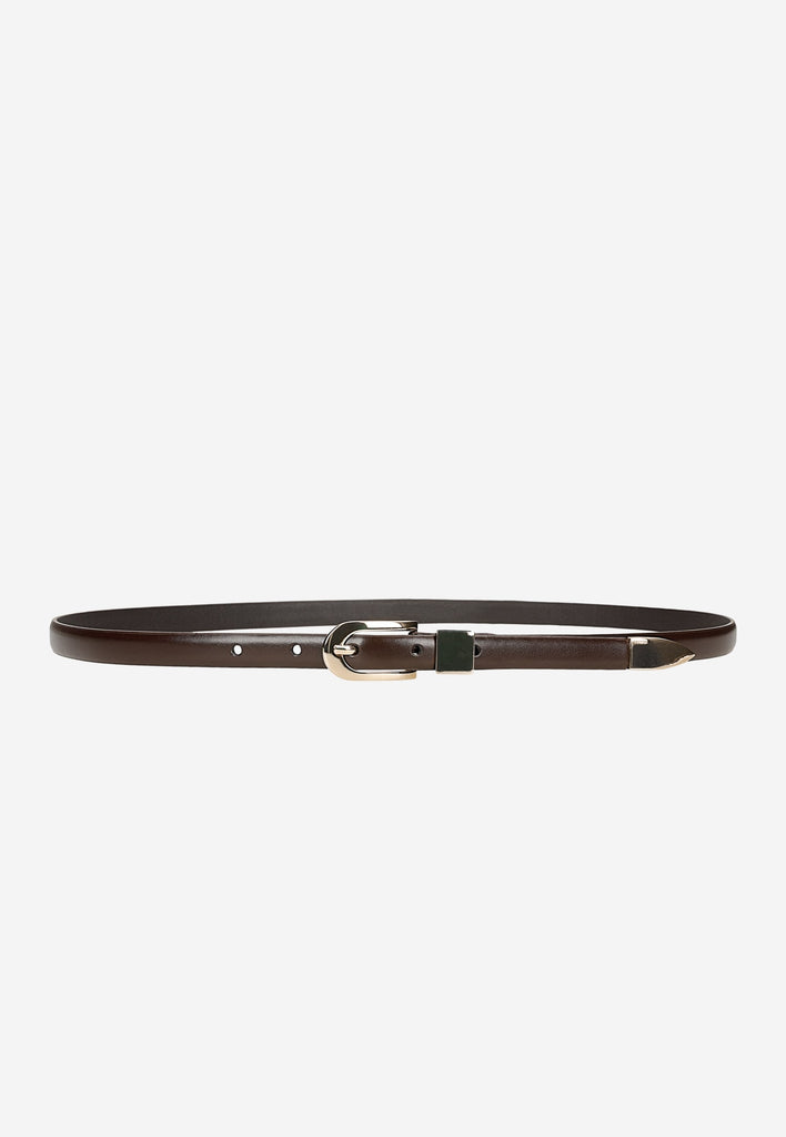 Wonderful thin black and burgundy belt with a golden buckle made of high-quality natural leather. This product will be a great addition to your everyday outfits.